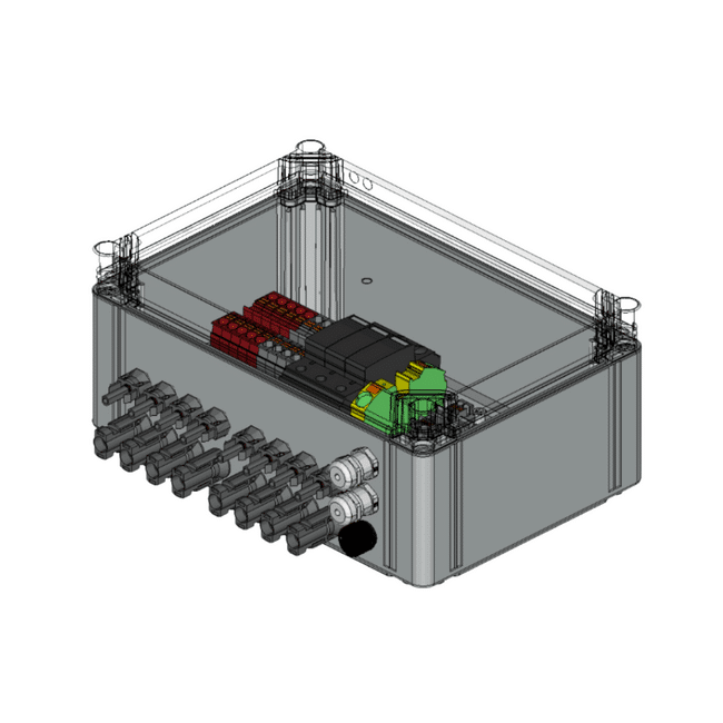 Deze Conduct PVbox is geschikt voor installaties waar gebruik gemaakt wordt van 1 MPP-trackers en 4 strings, de PVbox is uitgerust met 4 in en uitgangen en overspanningsbeveiliging type 1+2.