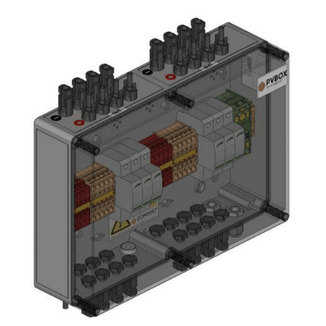 Deze Conduct PVbox is geschikt voor installaties waar gebruik gemaakt wordt van 2 MPP-trackers en 8 strings, de PVbox is uitgerust met 8 in en uitgangen en overspanningsbeveiliging type 1+2.