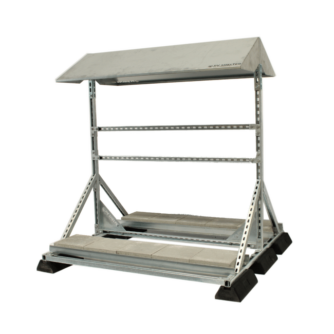 Vrijstaand montageframe van 158 cm breed voor het plaatsen van omvormers met de ruggen tegen elkaar. De maximale montagebreedte van de omvormers is 300 cm. De PVshelter, gemaakt van Magnelis®-staal, wordt gemonteerd geleverd, inclusief ballasttegels en mon