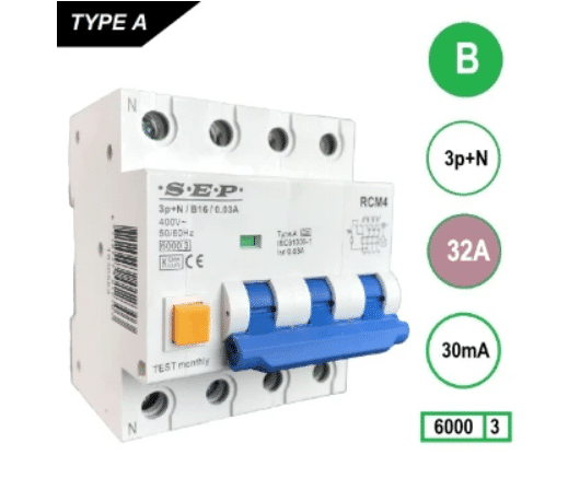 De SEP RCM4 Aardlekautomaat 3p+n B32 biedt uitgebreide bescherming voor driefasige elektrische installaties. Met een nominale stroom van 32A, een gevoeligheid van 30mA, en een kortsluitvermogen van 6kA, is deze automaat ontworpen om zowel overbelasting als aardlekken effectief te detecteren en te onderbreken, wat essentieel is voor de veiligheid in commerciële en industriële toepassingen.